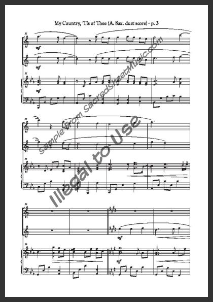 Alto Saxophone duet with piano accompaniment. A powerful, fresh setting of this popular American patriotic song – “America.”. Moderately level of difficulty.