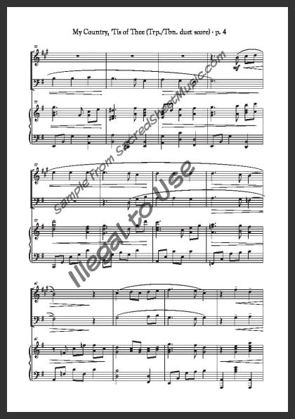 Mixed brass duet with piano accompaniment for trumpet and trombone. A powerful, fresh setting of this popular American patriotic song – “America.”. Moderately level of difficulty.