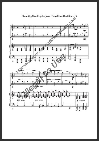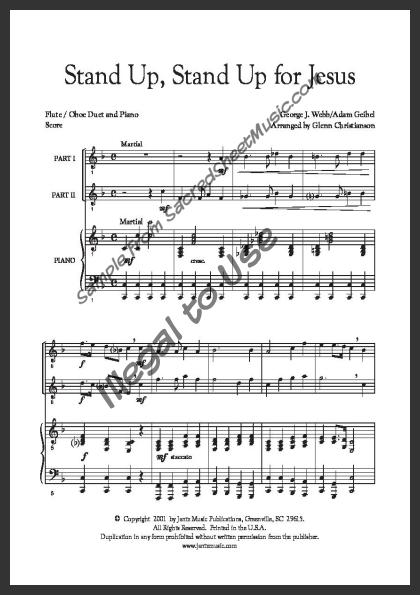 Mixed woodwind duet for Flute and Oboe with piano accompaniment. A rousing duet using both the Webb and Geibel hymn tunes. Moderate level of difficulty.