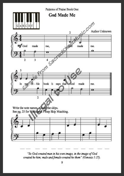 Patterns of Praise is a series of graded hymns and Bible songs for piano. This series is designed to complement standard teaching literature and to provide easy hymn arrangements accessible to very early levels of piano knowledge. Theory writing exercises and fun theory worksheets are included. Each song also has optional Bible memory verses for students to learn. I strive to produce a logical pedagogical progression by inserting original Bible verse and Bible story songs into the flow of standard hymns and children’s sacred songs. I hope you will enjoy these new songs.