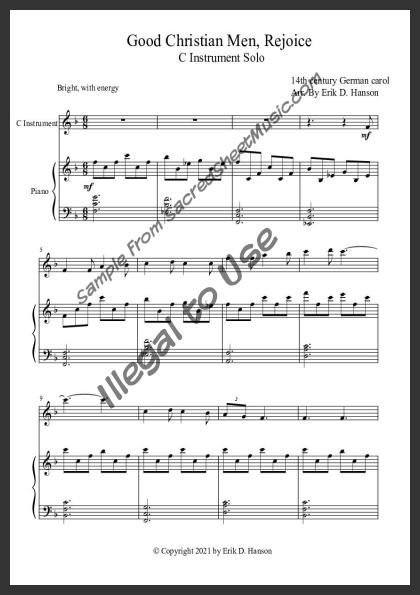 This C instrument (violin/flute), a moderately advanced arrangement, displays the excitement of Christ's birth. The solo part is included with the purchase in the PDF file. If there is any issue with the solo part, please let me know and I will email you the solo part pdf file.