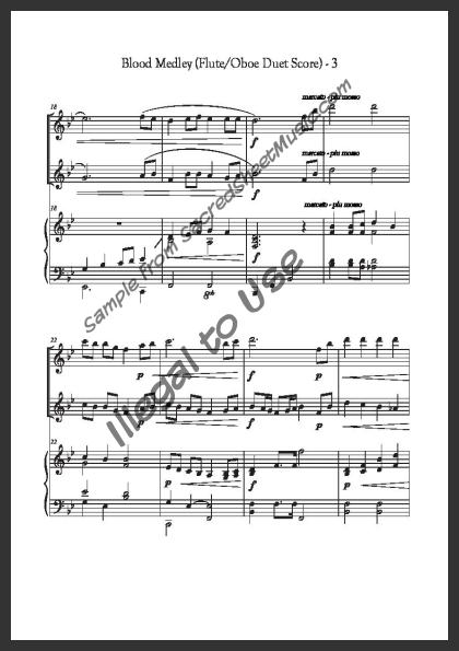 Includes the full score with piano accompaniment and separate duet parts for Flute I and Oboe II.