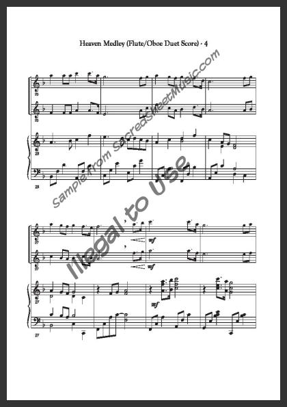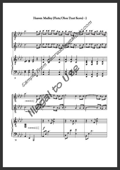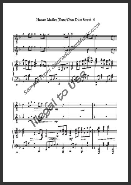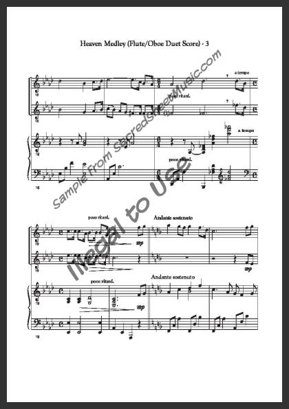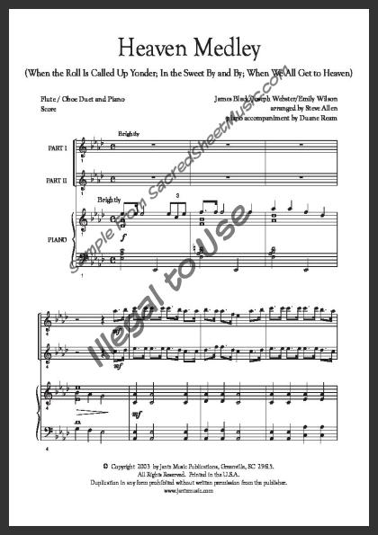 Mixed woodwind duet for Flute and Oboe with piano accompaniment. A very accessible medley of three hymns on Heaven - When the Roll Is Called Up Yonder, In the Sweet By and By, and When We All Get to Heaven. Moderate level of difficulty.
