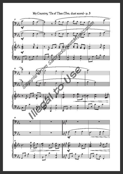 Trombone duet with piano accompaniment. A powerful, fresh setting of this popular American patriotic song – “America.”. Moderately level of difficulty.