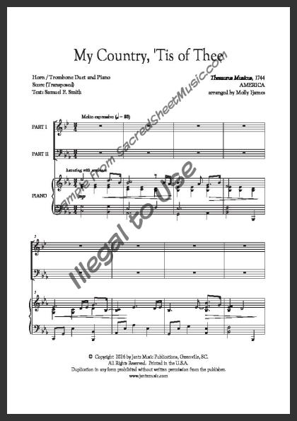 Mixed brass duet with piano accompaniment for horn and trombone. A powerful, fresh setting of this popular American patriotic song – “America.”. Moderately level of difficulty.