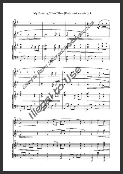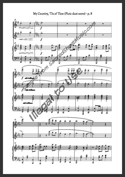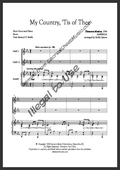Flute duet with piano accompaniment. A powerful, fresh setting of this popular American patriotic song – “America.”. Moderately level of difficulty.